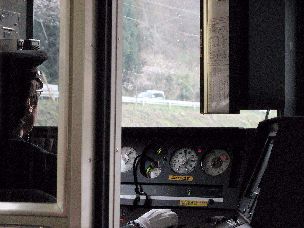 速度計の下に「221系性能」って注意書きシールが貼ってあります。