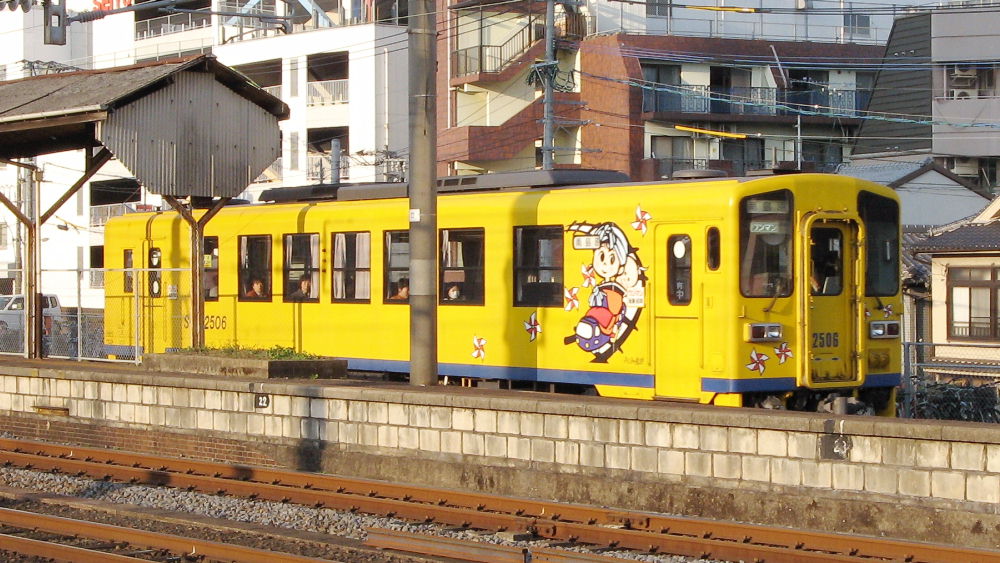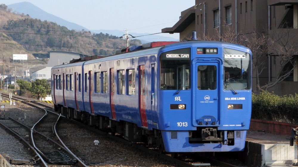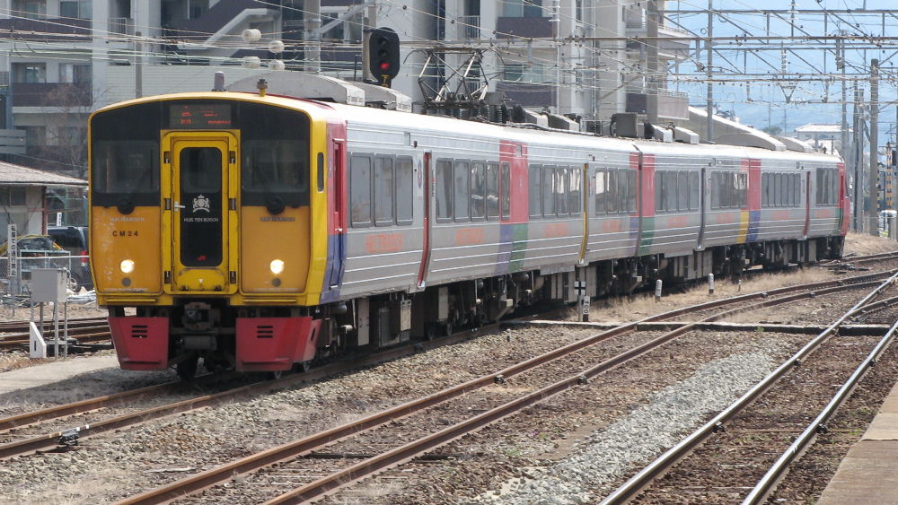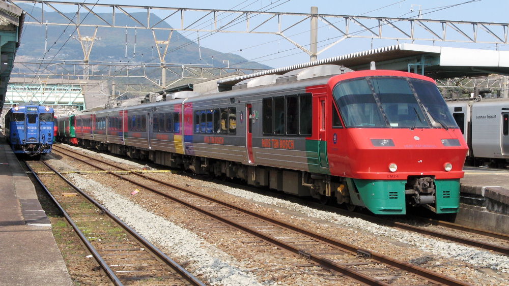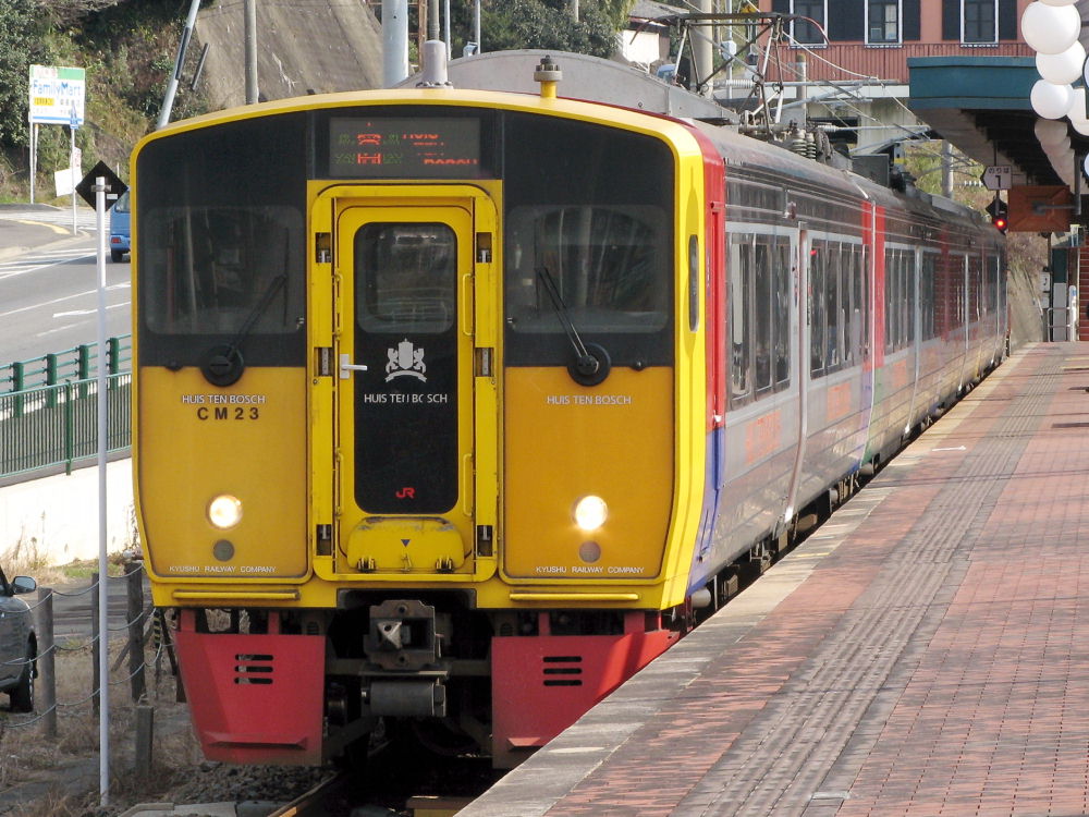 ハウステンボス駅を出発する「ハウステンボス」専用塗装の783系です。