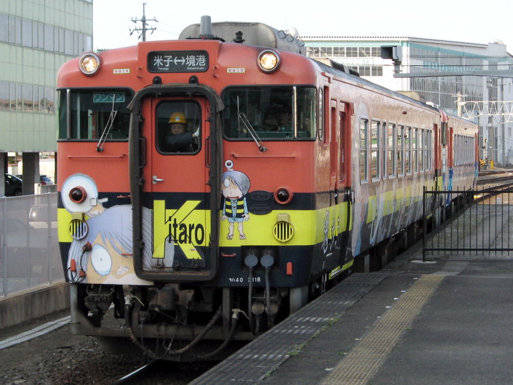 観光路線化事業がおこなわれています。 米子駅は・・・ 「ねずみ男駅」です^^ さらに境線のキハ40には「ゲゲゲの鬼太郎」のキャラクタが描かれてます。 これは「鬼太郎列車」。テールランプを利用して目玉おやじになってますw 2両連結された反対側は「目玉おやじ列車」でした^^ こちらは車両区の一番奥に留置してあった「ねこ娘列車」です。 かろうじてわかりますw こっちは遠くて暗くてよくわかりませんが「ねずみ男列車」です。 整備中なのかも... 21日には「鬼太郎列車」、「ねずみ男列車」、「ねこ娘列車」、「目玉おやじ列車」の 4両編成が運行されたようです。 ちなみに山陰線のキハ40には「どじょうすくい列車」もありました^^ 撮れませんでしたが (T_T) PR