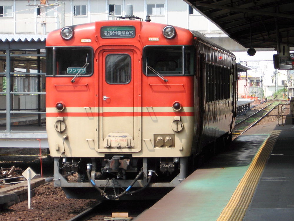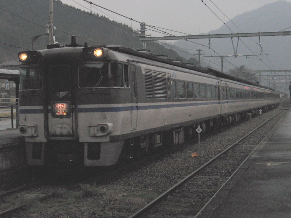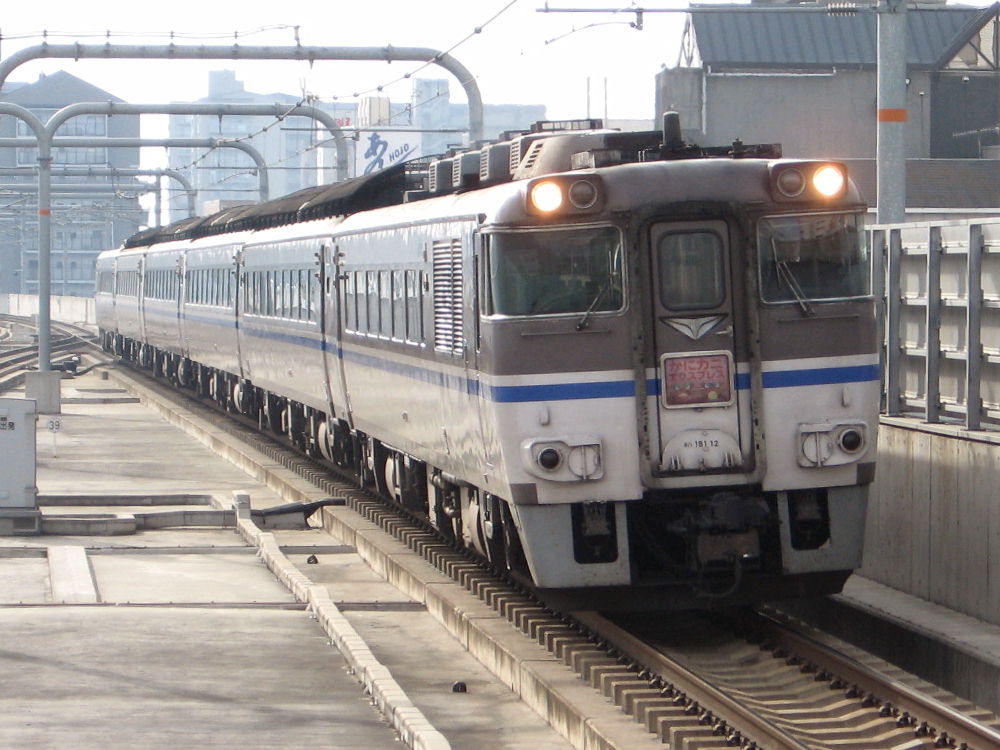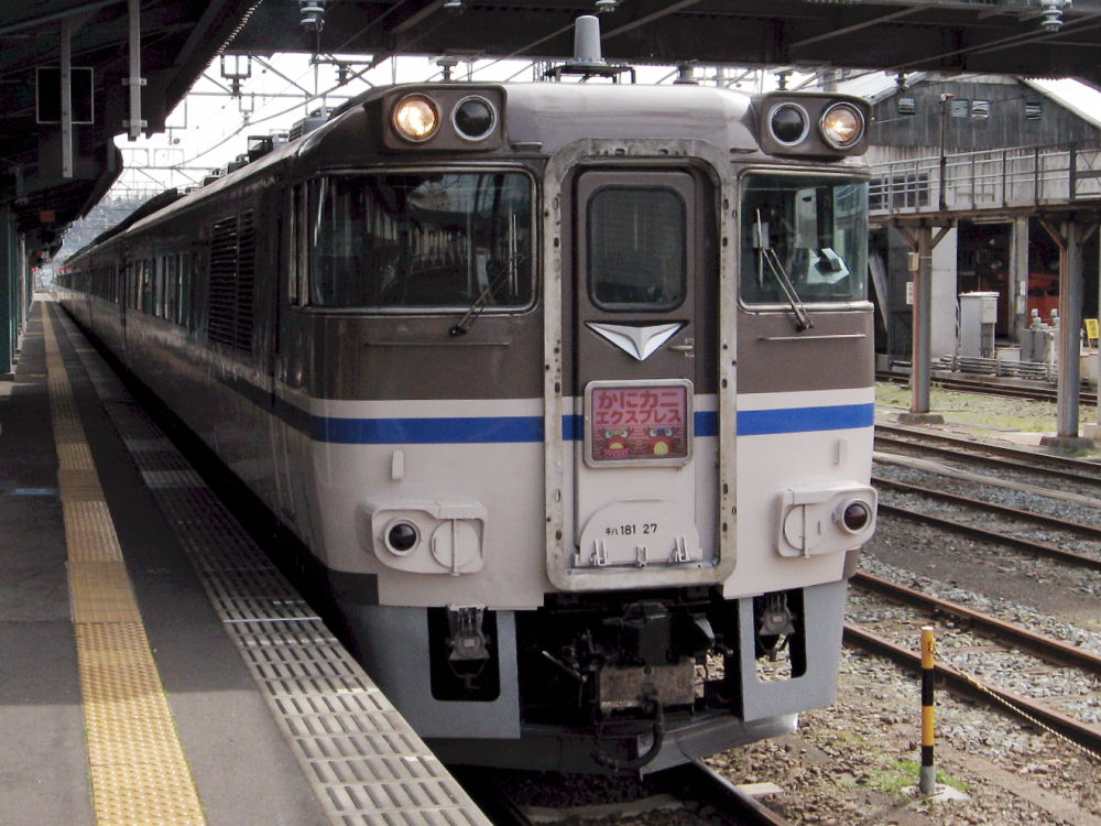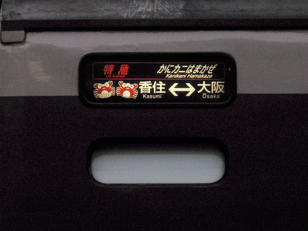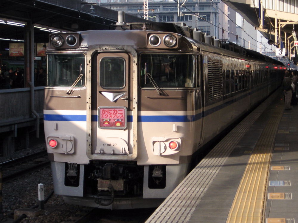 でも他にも撮ってる人が数人いました。キハ181は人気があるんかな? この特急より2分早く発車する新快速に乗って加古川へ行きました。 途中で追い越されるかなぁ~って思ってましたが・・・ やはり2分後くらいに到着しました^^ 特急だから停車駅は少ないけど、やはり気動車は加速も悪いし速度も遅いのでしょう。 大阪~姫路は、特急と新快速は同じ時間のようです。 のんびりと加古川線経由で豊岡まで行ったら、またさっきのキハ181がいました^^ 香住まで行って回送してきたようです。 姫路で方向転換するので、181-27が先頭に変わってます。 ヘッドマークをアップで見ると・・・ カニはオスとメスのようです。メスはスカート着てるのかな?w ヘッドマークには「かにカニエクスプレス」って書いてますが・・・ 列車名は「かにカニはまかぜ」号です。 「かにカニエクスプレス」というのは「JRの特急でカニ食べに行こぉ~」という 企画名でしょう。 豊岡からの帰り、17:00過ぎに播但線の寺前駅でまたまた撮りました^^ 雨が降ってきて暗いですが同じキハ181でした^^ 天気予報より降りだしが早かったです... なんか、まるで「かにカニはまかぜ」の追っかけをしてるような日でしたw 時間を見てたわけではないのですが^^ PR |